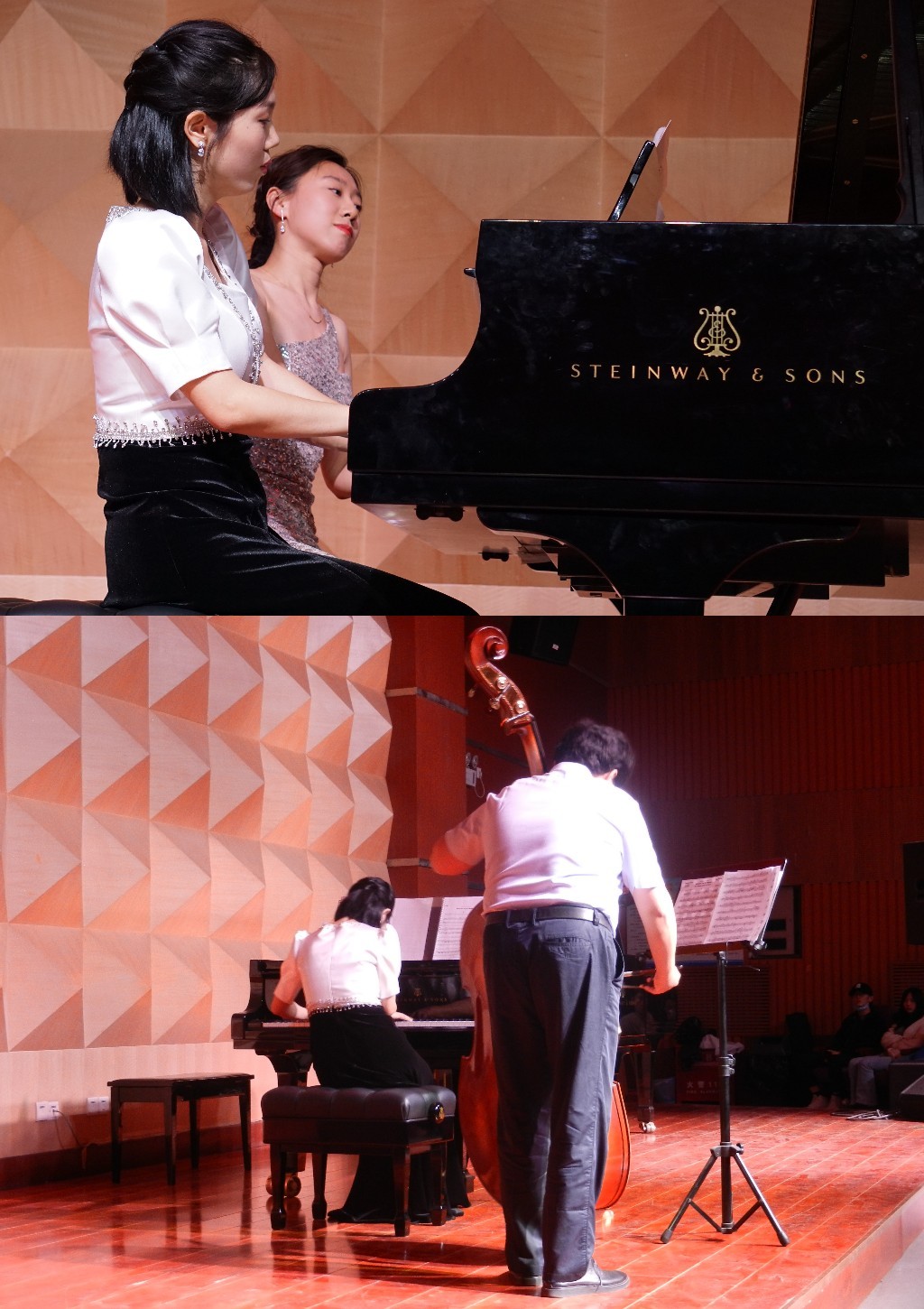 5月6日,黄陈沙杨合作钢琴音乐会在黄色仓库 小剧场顺利举行。音乐会分为外国作品与中国作品两个部分,包含器乐伴奏、声乐伴奏、钢琴四手联弹和双钢琴的形式,以多元的曲目和合作形式全面展现了合作钢琴专业的魅力。